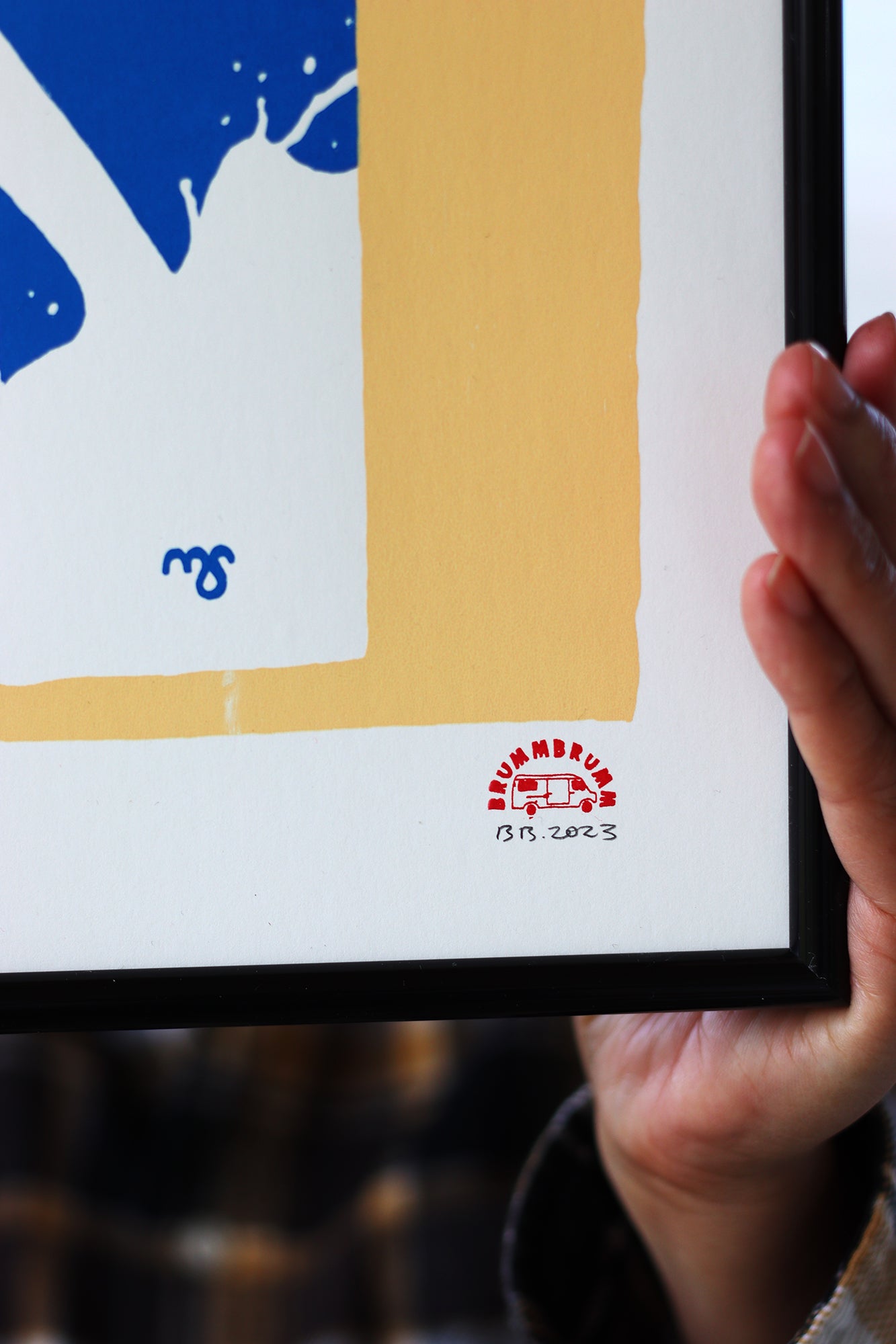 2 colour screen print, hand made, hand printed and hand illustrated in the Brumm Brumm mobile print studio Reykjavík, Iceland.